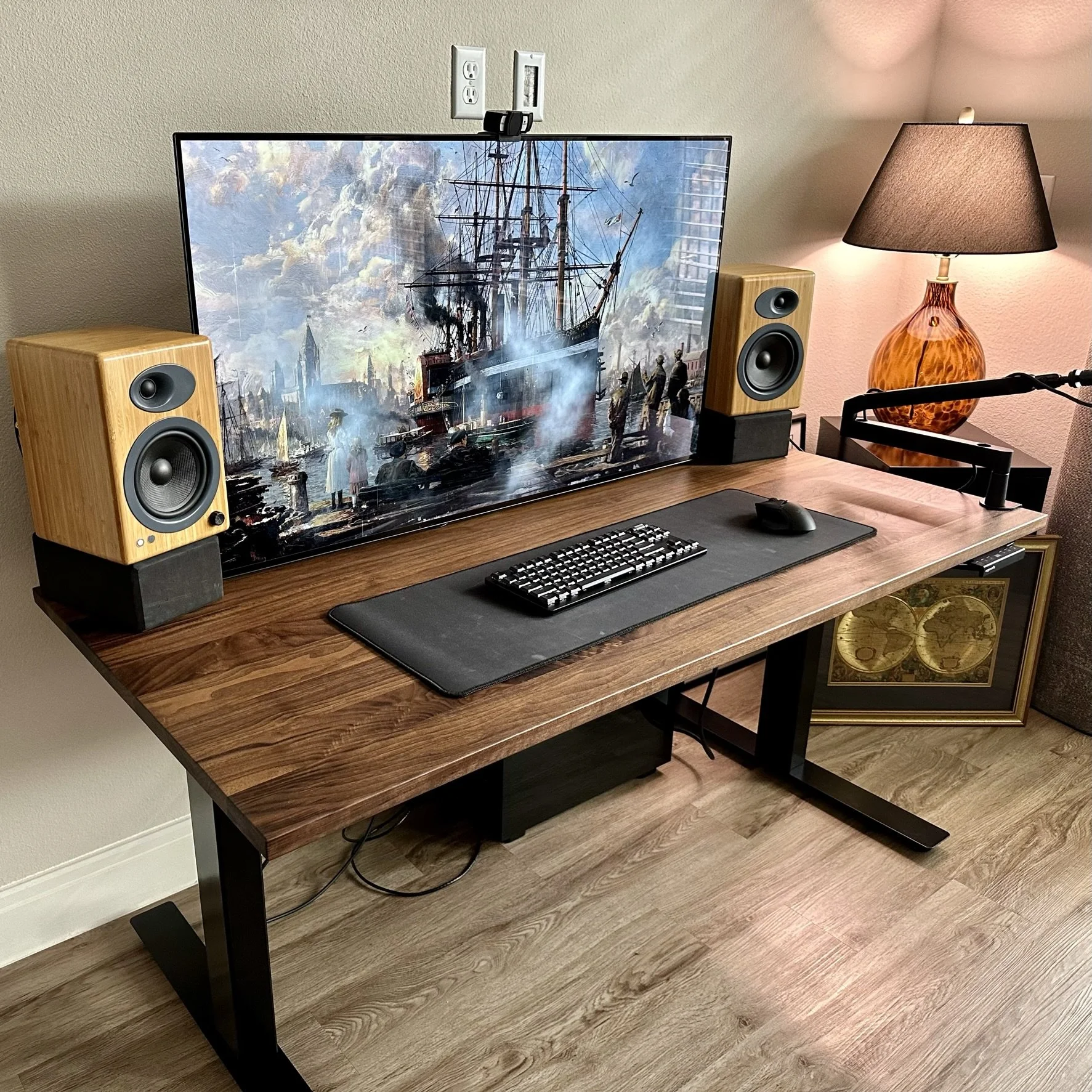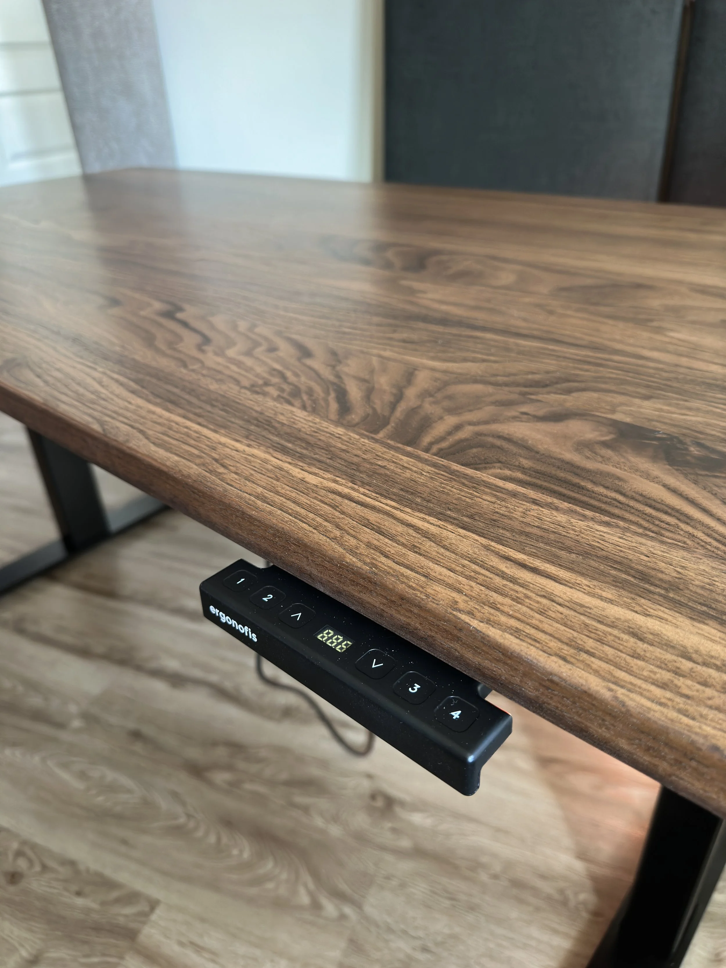 The design requirement was for a standing desk with specific dimensions and a beautiful top. For the base of the desk, a motorized standing desk was chosen, leaving only the top to design. To match the base, the design needed to present as minimalist and match the edge profile of the motorized base.